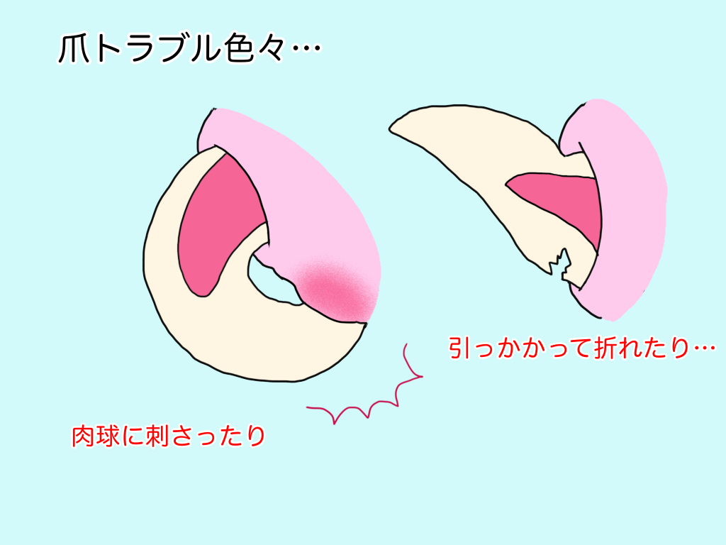 ただ、これも爪が長く伸びていることが原因になりますから、これも定期的な爪のケアで予防が可能です