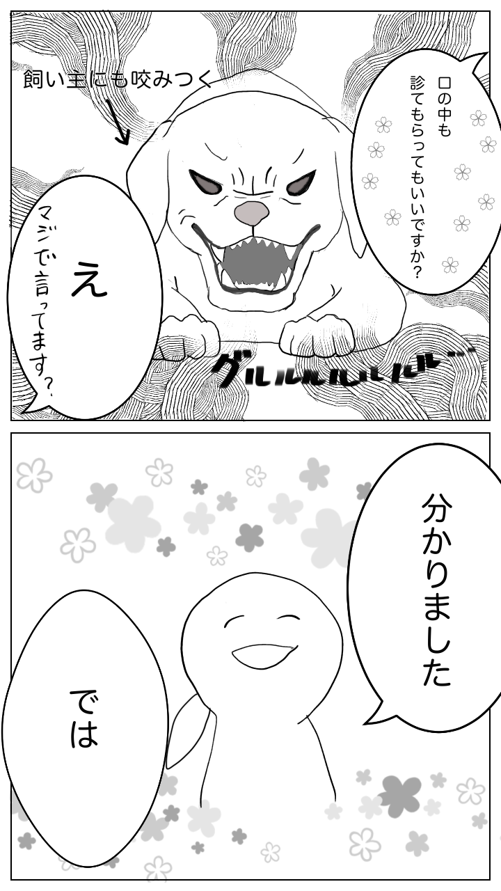 確かにエリザベスカラーや口輪をつければ顔以外は触ることができますが、この例のように飼い主さんでも触れない子は口の中を触るなんて到底無理です…
